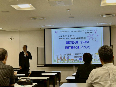 2025/10/09 知識セミナー&相談会終了ご報告 10/5に奈良県図書情報館で開催された「法務無料相談会&知識セミナー」は終了しました。 「遺言書のある時・ない時の相続手続きの違い」をテーマとしたセミナーでしたが、終了後の熱心なご質問も多数いただきました。 tagPlaceholderカテゴリ: